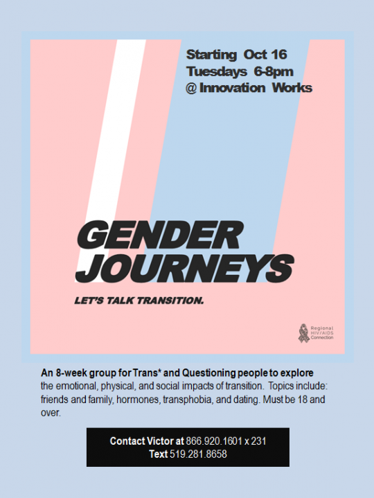 Starting October 16th, Gender Journeys is an eight week program for transgender or questioning youth (18+) to talk about the emotional, physical, and social impacts of transition Topics include: friends and family, hormones, transphobia, and dating. It will be held on Tuesdays from 6-8pm at Innovation Works!