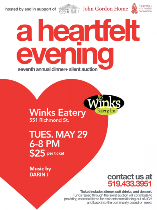 A Heartfelt Evening, hosted by and in support of John Gordon Home, is Tuesday, May 29th. Refer to poster for details and contact information. Learn more about John Gordon Home (a program of Regional HIV/AIDS Connection) here.