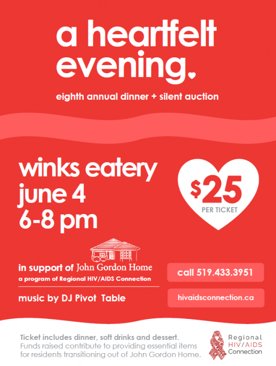A Heartfelt Evening is in support of John Gordon Home, a program of RHAC which provides a haven for individuals who are experiencing challenges in their lives due to HIV, HCV, and other complications. Funds raised contribute to providing essential items for residents transitioning out of John Gordon Home.