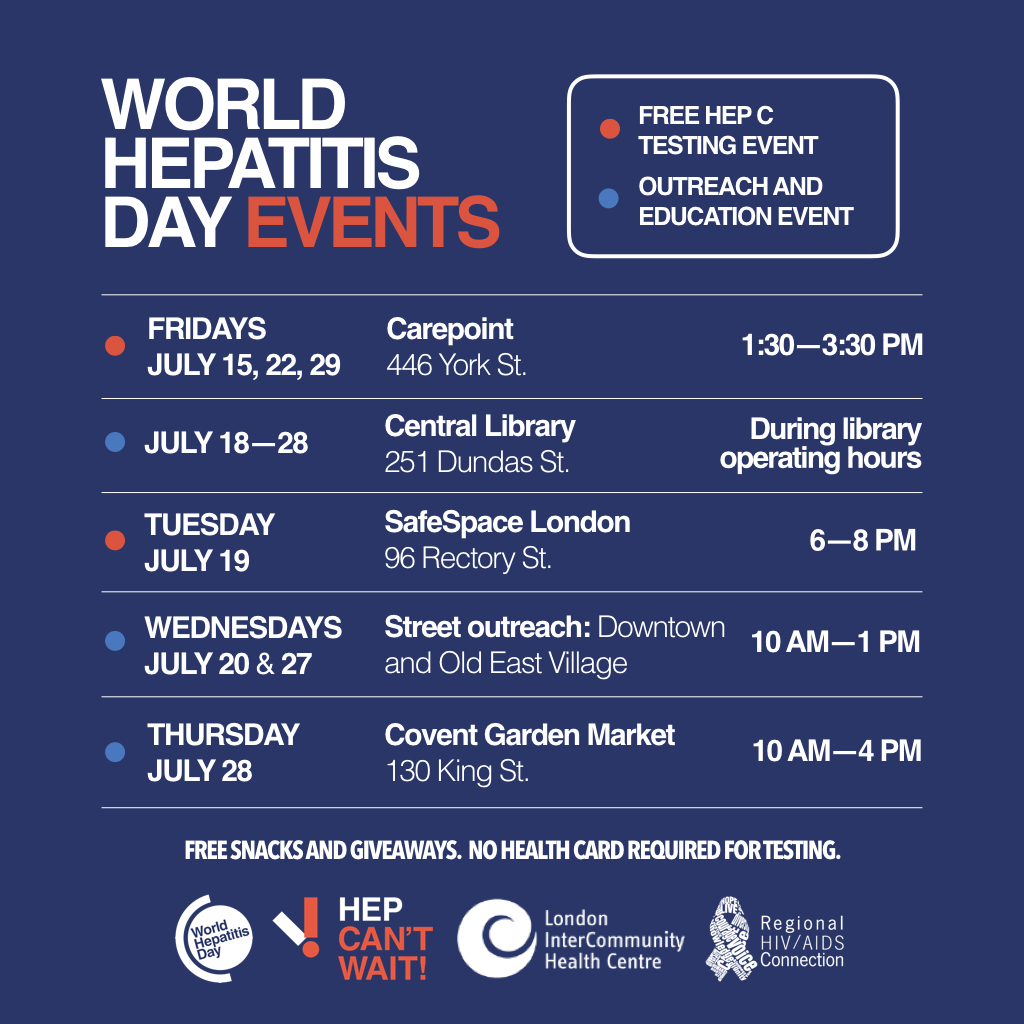 The only way to know if you have hepatitis C is to get tested for it. That's why Regional HIV/AIDS Connection (RHAC) and London Intercommunity Health Centre (LIHC) are hosting events at several locations all month long ahead of World Hepatits Day!